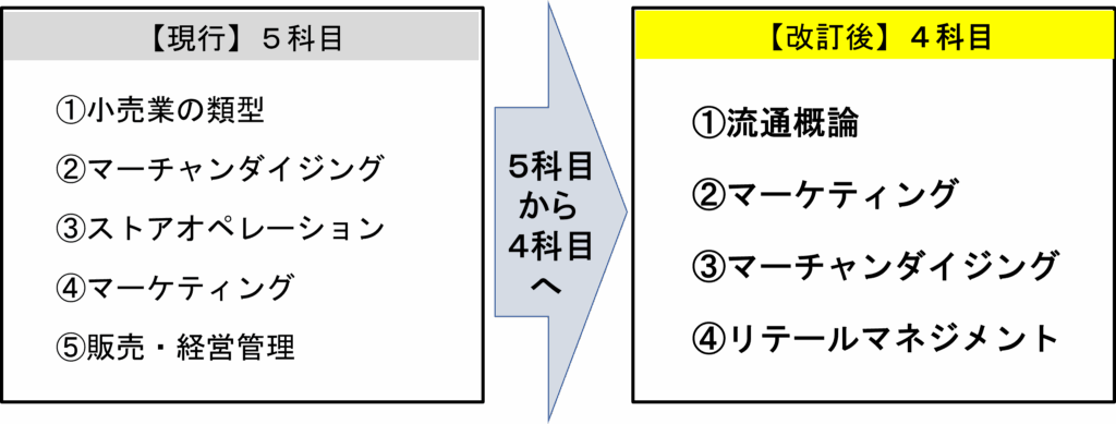 当所では、リテールマーケティング(販売士)検定試験について、デジタル対応や人手不足・生産性向上への対応など、小売・流通業の最新動向を十分に反映した出題内容とするとともに、時代にあった科目体系への見直し・整理を行うことといたししました。
