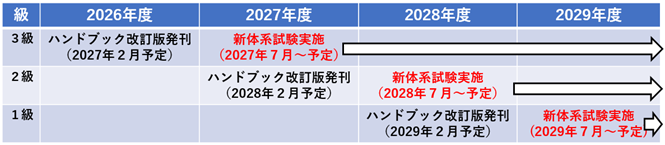 公式テキストである「販売士ハンドブック」の発刊、および新体系(4科目)での試験開始は、3級→2級→1級の順で、2026年度より1年毎に発刊・変更予定。